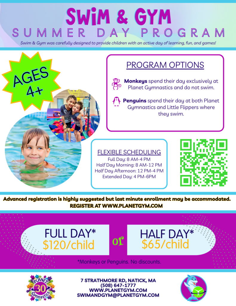 - During our summer program, your child may be doing some activities outdoors. These activities are specified with a picture of a sun on them in the events calendar. Planet Gymnastics will be providing sunscreen and bug spray for your child. If they require a specific type of sunscreen or bug spray please bring it in your child’s bag and let the staff know upon drop off.